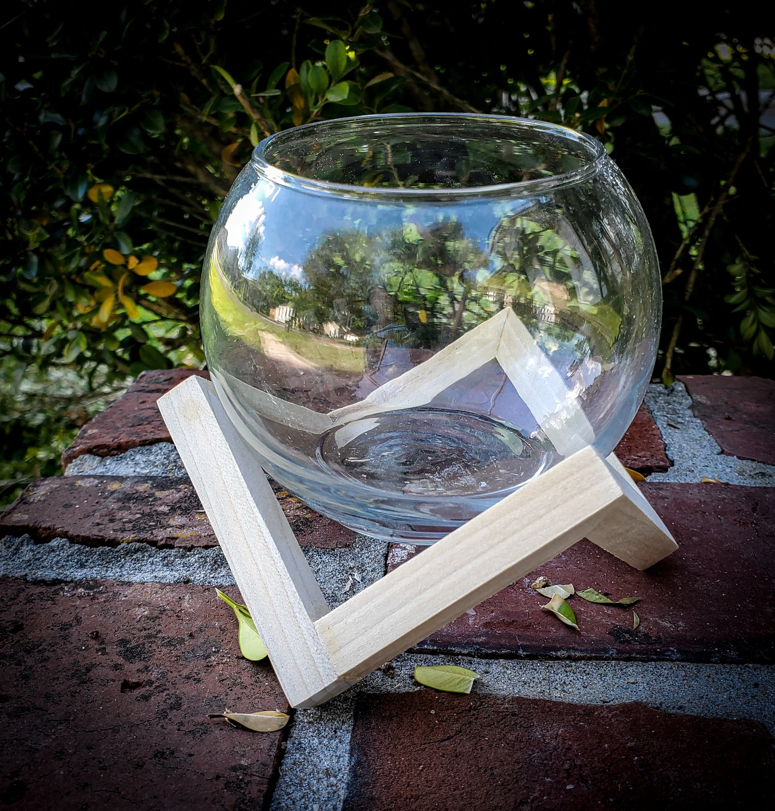 Glass globe comes with the geometric wooden base.