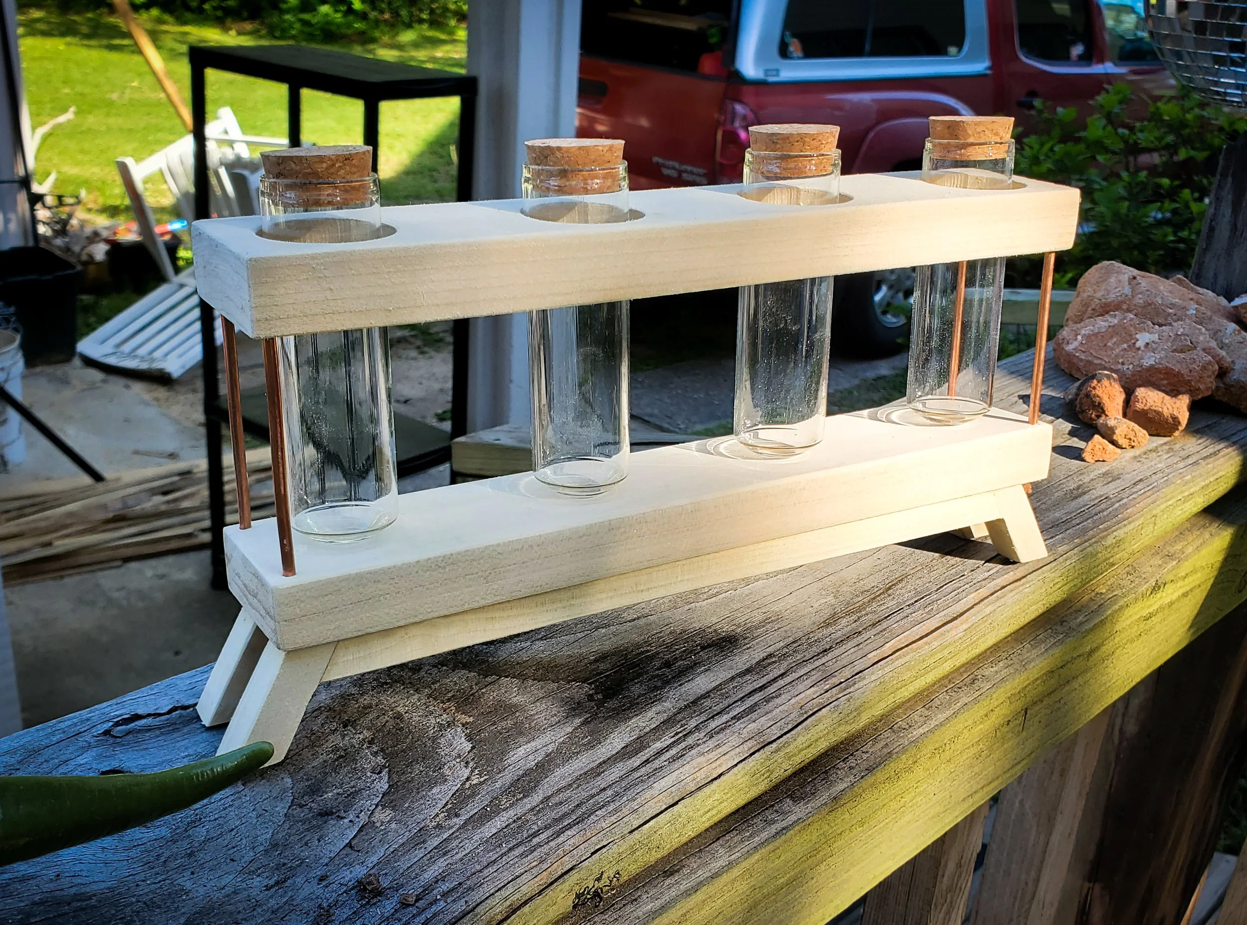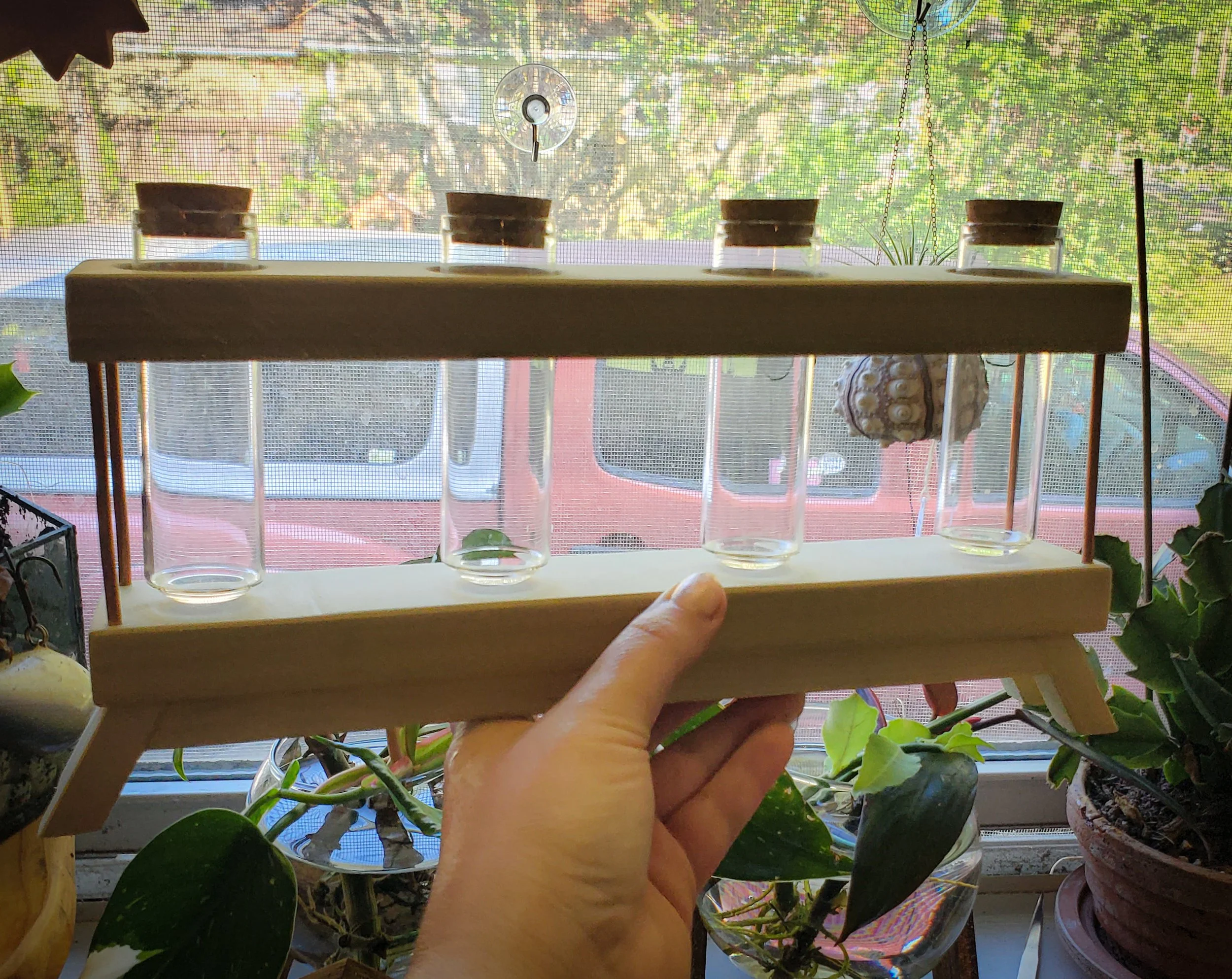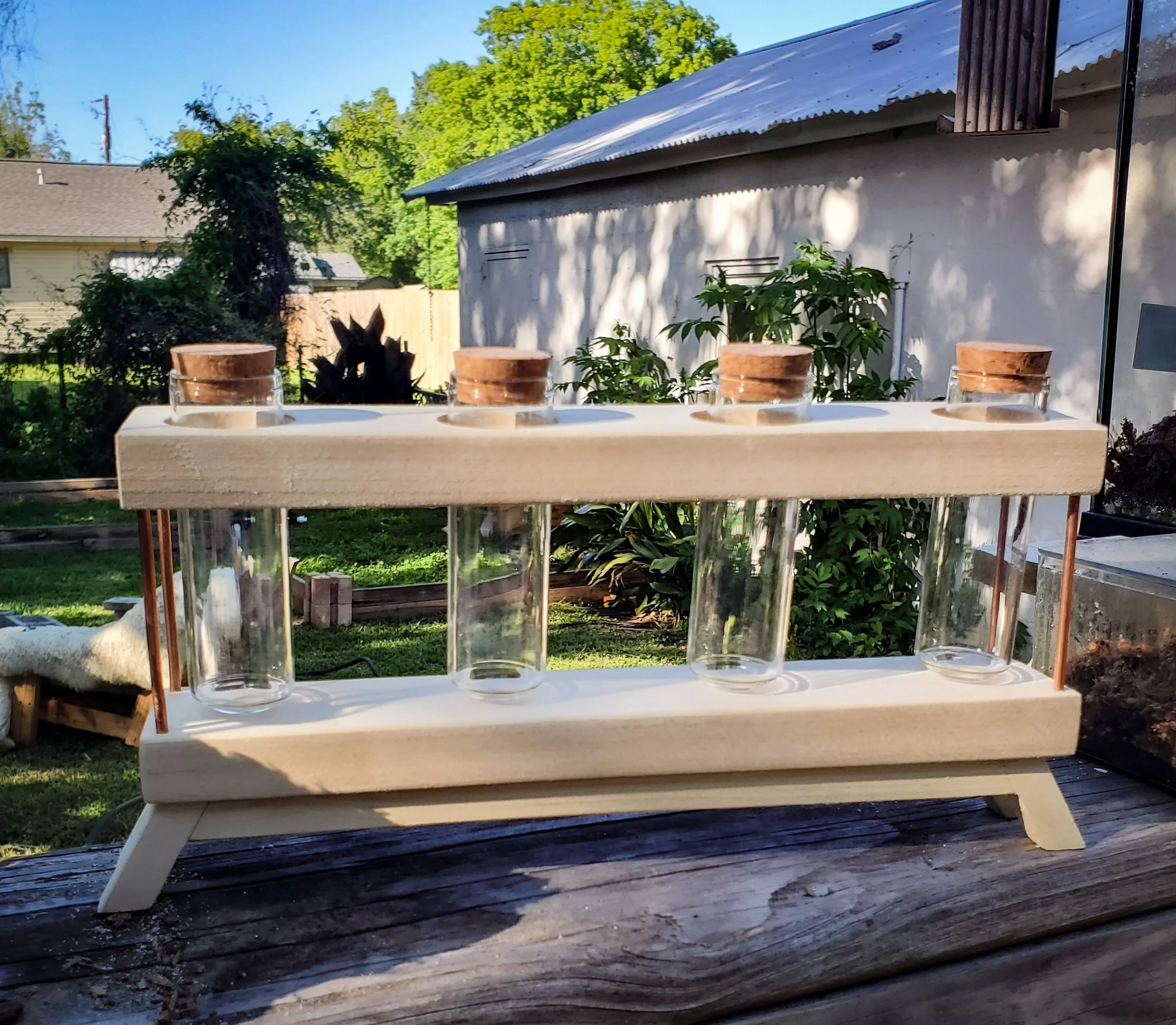Glass tube, wood and copper propergation station